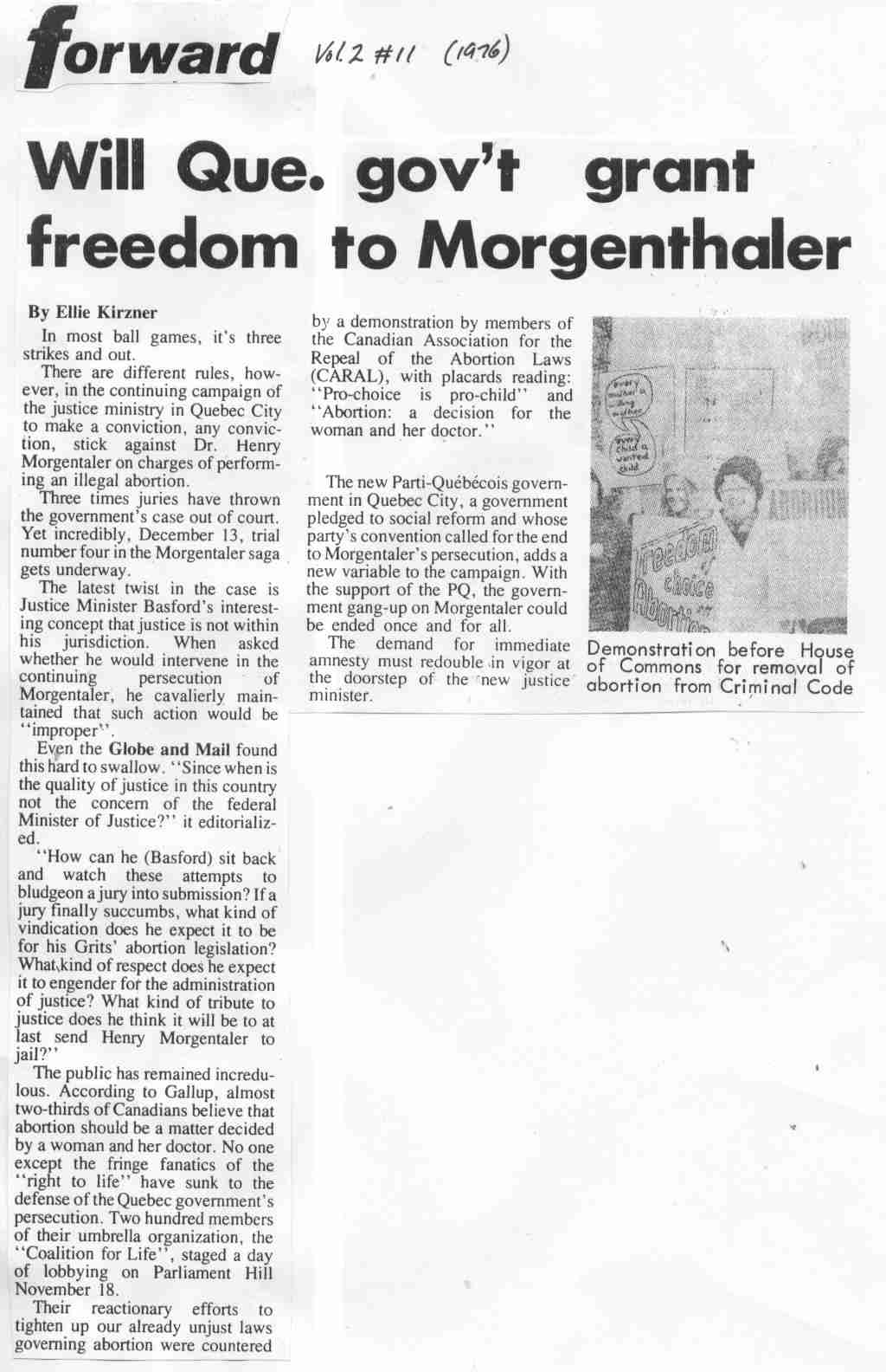 No. 11 | What course for (NDP) women’s caucus? Will Que. Gov’t grant freedom to Morgentaler? |