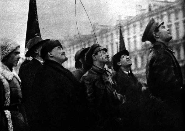 V. I. Lenin and Y. M. Sverdlov inspecting the memorial to K. Marx and F. Engels in Voskresenskaya Square (now Revolution Square). Moscow. November 7, 1918