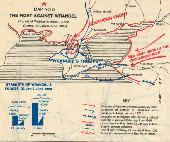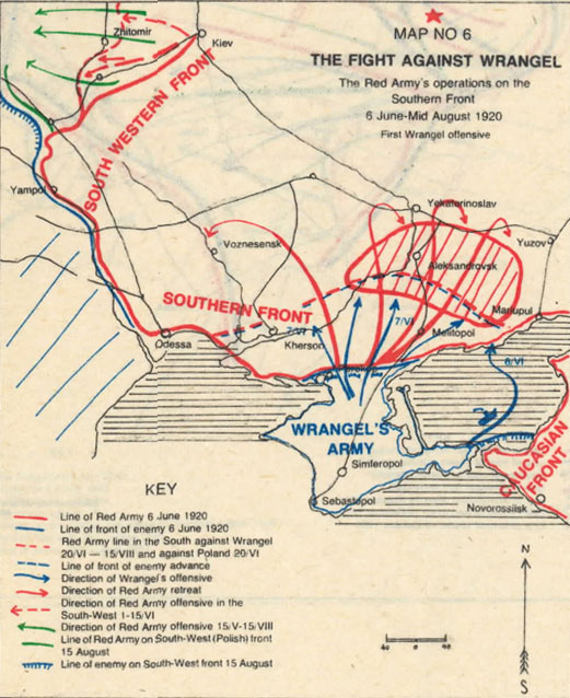 1. The Polish front concentrated on itself the entire attention of the Soviet Republic and the Red Army. This made it impossible to assign sufficient forces for the liquidation of the Crimean group of White Guards. Meanwhile, under Wrangel’s command and with much material aid from the Entente, a rapid restoration went forward in the Crimea of the forces which had gathered there from various quarters after the final defeat of Denikin. By the beginning of June, General Wrangel had succeeded in forming three corps and a strong force of cavalry. The Entente supplied this army with a wealth of technical resources for combat. On June 6 Wrangel began active operations. Exploiting his superiority in cavalry, he considerably extended his place d’armes, pushing us back towards the Dnieper, from that river’s mouth up to Nikopol, and also towards Berdyansk. His subsequent northward advance threatened the units of the South-Western front which were then pursuing the Kiev group of the White Poles (see maps Nos.5 and 6.)