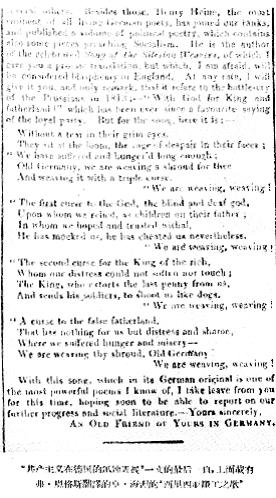 在他们悲愤的眼里不见一滴泪珠, 他们坐在织机旁,绝望的愤怒呈现在脸上。 “我们已饱经折磨和冻饿; 古老的德意志呵!我们正为你织着寿衣, 把三个诅咒织在寿衣上。 我们织呵,织呵! “一是诅咒上帝,那耳聋眼瞎的上帝。 我们信赖他,像孩子信赖他们的父亲, 我们对他满怀着希望和信任, 可是他却嘲笑我们,欺骗我们。 我们织呵,织呵! “二是诅咒那富人的国王, 我们的苦楚丝毫不能打动他那铁石心肠。 他抢走了我们的最后一文钱, 还要派兵来把我们当狗一样枪杀。 我们织呵,织呵! “还要诅咒那虚伪的祖国, 它给我们的只是痛苦和耻辱, 我们在它那里饱经饥饿和困苦, 古老的德意志呵!我们正为你织着寿衣。 我们织呵,织呵!” |