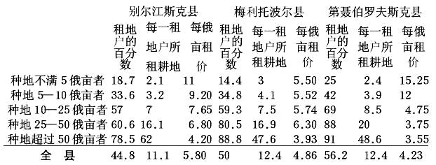 显然,除家庭人口外,每户的殷实程度也是决定份地数量的因素。 我们研究各类农民购买地数量的资料时可以看出,购买土地的几乎都是种地超过25俄亩的上等户,其中主要是每户种地75俄亩的最大的耕作者。可见,购买地的资料完全证实了波斯特尼柯夫关于农民有不同的类别的看法。例如作者在第147页上谈到“塔夫利达省各县农民购买了96146俄亩土地”时所引证的资料就根本不能说明问题,因为这些土地几乎全部掌握在占有份地最多的区区少数人手中,即掌握在波斯特尼柯夫所说的“富裕”农民手中,而这些农民不超过人口的1/5。 关于租地也必须这样说。上表中的租地一项包括份地的和非份地的租地。可以看出,租地面积完全随农民富裕程度的提高而相应地扩大,因此,一个农民自己占有的土地愈多,他租进的土地也愈多,从而也就剥夺了最贫苦户所需要的土地面积。 必须指出,这是全俄国的普遍现象。卡雷舍夫教授总结了俄国各地(只要那里有地方自治局统计机关的调查材料)农民非份地的租地情况,并把租地面积和租地户的富裕程度之间的直接依存关系表述成为一条普遍规律[注:《根据地方自治局的统计资料所作的俄国经济调查总结》第2卷,尼·卡雷舍夫著《农民的非份地租地》1892年多尔帕特版第122、133页及其他各页。]。 其次,波斯特尼柯夫还提供了更详细的关于租地(非份地的和份地的均在内)分配的数字,现在我把这些数字引证如下: ![]() 这里我们也可以看出,平均数字完全不能说明问题:因为我们说第聂伯罗夫斯克县有56%的农民租种土地,这句话只能给人们一个关于这种租地的极不完全的概念,因为在自己土地不够的(下面将说到)各类农户中,租地户的百分数低得多,例如在第一类中只有25%,而自己土地很多的上等户则几乎都租种土地(91%)。每一租地户所租土地在数量上的差别还更显著,例如上等户租的土地分别为下等户的30倍、15倍、24倍。显然,这也就改变了租地本身的性质,因为在上等户中这已是商业性的经营,而在下等户中这也许是由于极端贫困引起的。后一推测可以用租金方面的资料来证实:最低的几类付出的土地租金较高,有时竟比上等户付出的高3倍(在第聂伯罗夫斯克县)。这里必须提醒一点:租地愈少租金愈高并不是我国南部的特点,因为卡雷舍夫的著作证明这个规律是普遍适用的。 波斯特尼柯夫谈到这些资料时说:“塔夫利达省各县租种土地的多半是拥有足够数量的份地耕地和私有耕地的富裕农民;非份地即离村较远的私有地和官地的租种更是这样。其实这也是很自然的事情,因为租种较远的土地要有足够数量的役畜,而这里不大富裕的农民连耕种自己份地所需的役畜也不足。”(第148页) 不应该认为,上述租地分配情况,是由个人租种土地造成的。即使租种土地的是村团,情况也毫无改变,原因很简单,因为土地是按照同样的根据即“按照货币”来分配的。 波斯特尼柯夫说:“根据国家产业管理局清册,1890年三县按照契约出租的133852俄亩官地中,租给农民村团使用的可耕地有84756俄亩,即占全部面积的63%左右。但是,农民村团租来的土地是由为数不多的户主而且多半是由富裕户主使用的。地方自治机关的按户调查十分明显地指出了这一事实”(第150页)[注:波斯特尼柯夫并未列出下表的最后一项(三县总计)。他在表[6]下注明:“按照租地条件,农民只有权耕种租地的1/3。”]:[见第13页表格。——编者注] 波斯特尼柯夫总结道:“可见第聂伯罗夫斯克县富裕农户使用了全部租地的1/2以上,别尔江斯克县则在2/3以上,而在租种官地最多的梅利托波尔县甚至占租地面积的4/5以上。三县最贫苦农户(种地不满10俄亩者)一共只有1938俄亩,即租地的4%左右。”(第150页)作者接着又提供了一连串的例子来说明村团租来的土地分配不均,但这些例子不必引用了。 谈到波斯特尼柯夫关于租地决定于租地户的富裕程度的结论时,指出地方自治局统计人员的相反意见是极有意义的。
