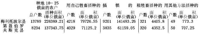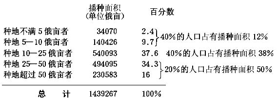 波斯特尼柯夫采取的划分方法的另一个不便之处,在于地方自治局的统计(如上文所指出的)不是按役畜头数而是按播种面积把居民分类的。因此,要能确切地表现各类农民的财产状况,就得采取按播种面积分类的方法。波斯特尼柯夫按这一标志也把居民同样分为三类:种地少的户主,即种地不满10俄亩和不种地的;种地中等的户主,即种地10—25俄亩的;种地多的户主,即种地超过25俄亩的。作者称第一类为“贫苦户”,第二类为中等户,第三类为富裕户。 关于这三类的数量,波斯特尼柯夫说: “一般说来,在塔夫利达农民中(不包括移民),种地多的占农户总数的1/6左右,中等的占40%左右,种地少和不种地的占40%多一些。而在塔夫利达省各县的全部居民(包括移民)中,种地多的占居民的1/5或20%左右,中等的占40%左右,种地少和不种地的占40%左右。”(第112页)