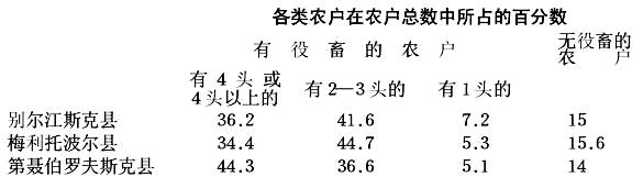 这些数字本身不能说明类别,这一点等以后叙述耕作机具和划分农民经济类别时再来说明。这里我们只指出,各类农民在拥有役畜数量上的差别是那样巨大,以致我们看到上等户的牲畜远远超过他们家庭的需要,而下等户的牲畜(尤其是役畜)却少得连独立经营也不可能。 关于农具分配的资料也完全相同。“按户调查曾把农民的农具即犁和多铧浅耕犁进行登记,提供了说明三县全部居民情况的下列数字”(第214页):