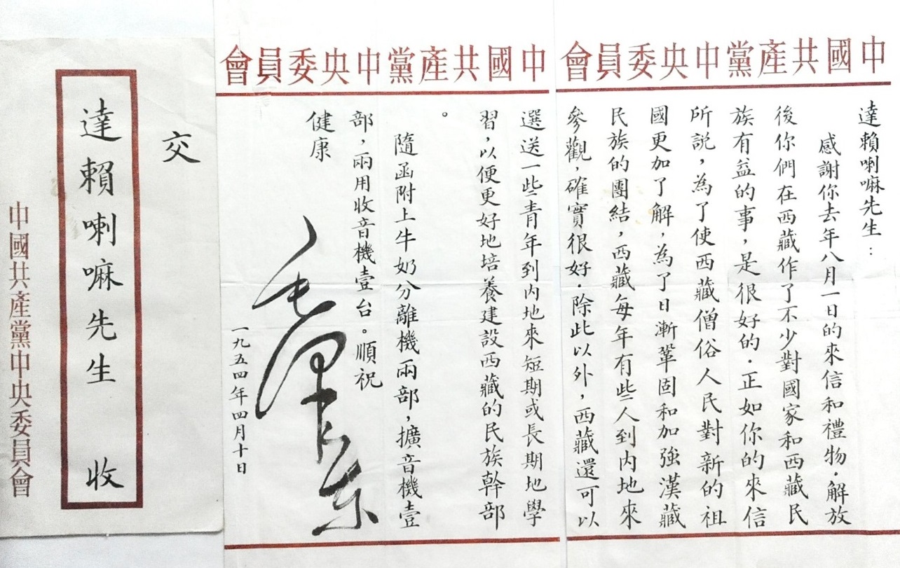 感谢你去年八月一日的来信和礼物。解放后你们在西藏作了不少对国家和西藏民族有益的事,是很好的。正如你的来信所说,为了使西藏僧俗人民对新的祖国更加了解,为了日渐巩固和加强汉藏民族的团结,西藏每年有些人到内地来参观,确实很好。除此以外,西藏还可以选送一些青年到内地来短期或长期地学习,以便更好地培养建设西藏的民族干部。