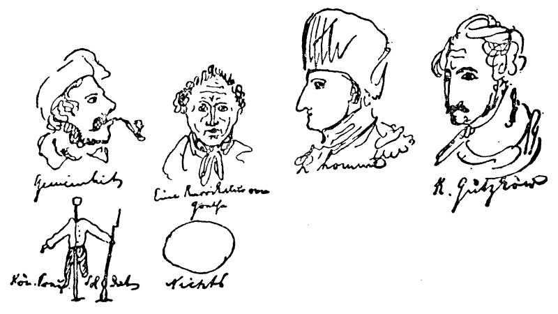 这是谁的作品?是卡尔·倍克的《浪游诗人》的片断,他的诗句雄浑有力,形象美好动人,但意思含糊不清,叙述过分夸张,比喻太多。席勒是我们最伟大的自由主义诗人,这已是定论了。他预感到,法国大革命以后将开始一个新的时代,而歌德甚至在七月革命以后也感觉不到这一点;当事件已近在眼前以致他几乎不得不相信某种新事物正在到来时,他却走进内室,锁上了门,以求安逸。这对歌德十分有害;可是当革命爆发的时候,歌德四十岁了,已经是一个定型的人了,所以不能为此责备他。我想为你画一些东西[注:插图下的说明(自左至右):Gemeinheit(低级趣味);Eine Karrikatur von Goethe(歌德的漫画像);L’homme(人);K.Gutzkow(卡·谷兹科夫);Kön.Preuß.Soldat(普鲁士王国士兵);Nichts(子虚乌有)。——编者注]来结束这封信。