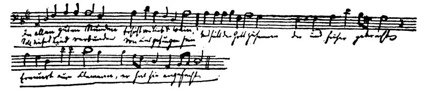 我又忘了画小节线,让霍伊泽尔替你填上吧。曲子是动人的,由于和声中始终保持着质朴的气息,没有任何一首歌曲能够同它相比。从E到D提高了六度,从B到A迅速降低了八度,这样处理是很出色的。关于对莱奥纳多·莱奥的《怜恤》[注:《怜恤》原文是《Miserere》。一般指圣经《旧约·诗篇》第51篇,因为该篇开头第一句是“Miserere mei,Deus”。莱奥的作品也用这句话的第一个词作为标题。——译者注]的意见我将写信给霍伊泽尔。