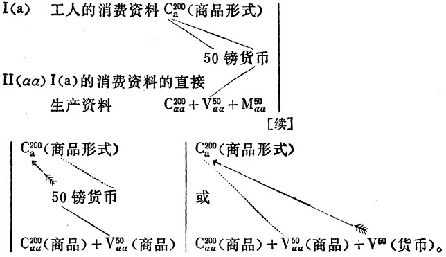 资产阶级的呆痴,在这里暴露得淋漓尽致了!(自杀!)(2) (Ⅰ)消费资料: ![]() (Ⅱ)生产资料: ![]() (生活上必需的消费资料的〔生产资料〕) ![]() (资本家的消费资料的〔生产资料〕)。 在(Ⅰ)项中,我们已考察运动的最简单的形式。现在,我们对其较复杂的形式进行考察,这可以使人们看到,构成Ⅰ和Ⅱ的工业部门不管如何形形色色、五花八门,这也不会改变问题的实质,虽然这种往返运动,以及作为这一运动的媒介的货币流通由此而复杂化了。 首先,我们在Ⅰ中把产品分为两种,从而分为两大生产领域,这就是:(1)工人必要消费资料的生产和(2)资本家的消费资料的生产。从我们在这里提出的目的来看,问题并不会由于下述情况而发生变化:在一定的限度内奢侈品可以进入工人阶级的消费,而另一方面,足够数量的生活必需品要进入资本家的消费,——这就是说,同种产品和同一生产部门的产品会出现在两个部类中。 我们先考察消费和再生产的货币流通媒介。 首先,我们看到在Ⅰ(a)中有300镑的产品充当工人的消费资料。在这个生产领域中,资本家预付50镑货币购买劳动力;工人用这50镑货币从这些资本家那里购买50镑的商品(=V50a)。这50镑只在Ⅰ(a)的资本家和工人之间进行流通。 其次,在Ⅰ(b)中,我们看到有300镑的产品充当资本家的消费资料。资本家预付50镑货币购买劳动力;工人用这50镑货币在Ⅰ(b)中向Ⅰ(a)购买50镑的商品(=M50Ⅰa)。Ⅰ(a)的资本家用这50镑货币购买Ⅰ(b)的产品(=V50b),即供他们消费的Ⅰ(b)类的消费资料。于是,他们用来支付工资的那笔货币资本同时流回到Ⅰ(b)的资本家手中。最后,M50Ⅰ(b)这笔基金是在这一类的资本家之间借助于25镑的货币流通而进行分配的。实际上,V50(Ⅰa)同M50(Ⅰa)相交换。 在Ⅰ中,经过这次周转以后,情况是这样的:Ⅰ(a)的资本家还拥有200镑的必要消费资料(C200a)和再度购买劳动力的50镑货币资本。Ⅰ(b)的资本家还拥有200镑的资本家的消费资料(C200b)、再度购买劳动力的50镑货币资本以及用于这些资本家的收入流通的25镑。C200(a)(Ⅰ)和C200(b)(Ⅰ)应当从产品形式重新转化为这种产品的生产资料。这是通过Ⅰ和Ⅱ之间的流通而实现的。 我们先考察Ⅱα+Ⅱαα,即Ⅱ中由工人消费资料的生产资料构成的那部分产品。 [168]在Ⅱ(αα)中,50镑货币被预付在劳动力上,Ⅱ(αα)的工人用这50镑货币向Ⅰ(a)购买相应数量的消费资料。 这样一来,现在,经过这一交易以后,Ⅰ(a)的不变资本就由C150a商品和50镑货币组成。Ⅰ的资本家用这50镑货币向Ⅱαα购买50镑的商品(=V50Ⅱ)。因此,用于可变资本流通的货币资本流回到资本家Ⅱ(αα)的手里,他们总是用它支付工资。 其次,Ⅱ(α)的资本家把50镑货币花费在劳动力上。工人用这50镑货币向Ⅰ(a)购买商品;Ⅰ(a)的资本家用这50镑货币向Ⅱ(αα)购买商品(=M50αα)。 所以,现在情况是这样。 Ⅱαα的资本家拥有100镑商品(=V50αα+M50αα)。他们还拥有200镑商品(C200),作为他们的可变资本货币形式的100镑货币以及他们的剩余价值借以实现的50镑货币。(他们的剩余价值的货币形式。)Ⅱα的资本家还拥有自己的全部产品,此外,他们还花费了50镑货币,这些货币现在处在Ⅱαα的资本家手中。Ⅱαα的资本家用这50镑货币向Ⅱα的资本家购买50镑商品,这样,Ⅱα的资本家的可变资本流通所必需的货币资本又流回到Ⅱα的资本家手里。 现在我们来看看Ⅱβ和Ⅱββ。 Ⅱββ把50镑货币预付在劳动力上。Ⅱββ的工人用这50镑货币向Ⅰ(a)购买50镑商品。Ⅰ(a)用这50镑向Ⅱ(αα)购买50镑商品。Ⅱαα用这50镑购买Ⅰ(b)的剩余价值50镑。Ⅰ(b)用这50镑向资本家Ⅱββ购买50镑商品,这样,Ⅱββ的资本家的可变资本流通所必需的货币资本又流回到资本家Ⅱββ的手里。 为更明白起见,我们把到此为止完成的一切交易按照我们所考察的顺序列表如下。 在Ⅰ内部的周转完成以后,所呈现出的情况是这样的: (Ⅰ)工人的消费资料: C200a(商品形式)+V50a(货币形式和劳动力形式) +资本家的消费资料: C200b(商品形式)+V50b(货币和劳动力)+用于收入流通的25镑。 因为这里所计算的125镑货币在Ⅰ的内部不断流通,所以我们在考察Ⅰ和Ⅱ之间的交换时,可以把其中的第一类归结为: Ⅰ(a)工人的消费资料:C200a(商品形式) +(b)资本家的消费资料:C200b(商品形式); 因为这是Ⅰ中同Ⅱ发生流通的唯一的商品。 现在先是Ⅰ(a)和Ⅱαα之间发生局部流通。 Ⅱαα先预付50镑购买劳动力。工人用这50镑货币向Ⅰ(a)购买50镑商品;Ⅰ(a)的资本家用这些货币向Ⅱαα购买50镑商品。这样一来,可变资本流通所必需的货币资本重新流回到资本家Ⅱαα的手里。 于是,我们得出: (1)Ⅰ(a)和Ⅱαα之间以及Ⅱαα内部的第一次局部流通![]() 这第一次流通的结果是: Ⅰ(a)工人的消费资料: C150a(商品形式) + C50(αα的生产资料形式=V50αα) Ⅱ(αα)(a)的消费资料的直接生产资料: C200αα(商品)+V50αα(货币)(劳动力)+M50αα(商品)。 [169]最好总是从作为流通起点的循环来开始描述序列。 这样,第一次局部流通的结果可以表示如下: Ⅱ(αα)αα的生产资料。 C200αα(αα的商品)+V50αα(50货币+A)+M50αα(αα的商品)。 Ⅰ(a)工人的消费资料。 C50a(α)(αα的生产资料形式=V50Ⅱαα) + C150a(消费资料形式)。 (2)Ⅱα内部以及Ⅱα、Ⅰ(a)和Ⅱαα之间的第二次局部流通Ⅱα的资本家投入50镑货币作为可变资本;工人用这50镑货币向Ⅰ(a)购买50镑商品。Ⅰ(a)的资本家