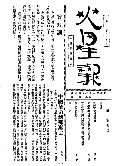 《火星报》1932年5月9日创刊于北京。发刊期数、停刊时间不详。