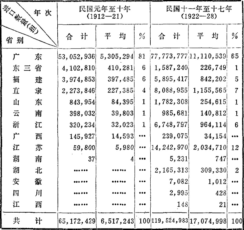民九及十八两年各省暨全国平均每人所占进出口商品数量的比较表[7]