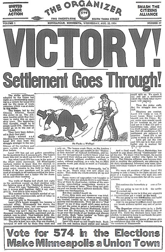 这段宣言马上就得到了证明。8月27日,自从血腥星期五之后就开始罢工的洗衣工人终于迫使老板签订协议,提高了工资,改善了劳动条件。574分会大获全胜之后,洗衣工人马上又赢得了胜利,这鼓舞了其它行业的工人奋起反抗老板。罢工一场接着一场,越来越多的工人参加了把明尼阿波利斯变为工会城市的斗争。574分会已经成为了明尼阿波利斯工人运动的主要力量,在每一场斗争中,工人都会去找574分会,希望574分会能够提供帮助和指导。