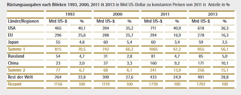Um diese Gruppe etwas auszuleuchten die folgenden ergänzenden Angaben: Zu den Nicht-NATO-Staaten, die zugleich aber eindeutig zum westlichen Rüstungspotential zu rechnen sind, zählen die folgenden Länder (in Klammern jeweils die Höhe der Rüstungsausgaben dieser Staaten im vergangenen Jahr): Saudi Arabien (67 Mrd. US-Dollar), Japan (59 Mrd.), Australien (24 Mrd.), Südkorea (34 Mrd.), Taiwan (11 Mrd.), Oman (9 Mrd.), Indonesien (7,8 Mrd.), Philippinen (3,5 Mrd.), Katar und die Vereinigten Arabischen Emirate (ca. 10 Mrd.). Allein die hier aufgeführten Staaten bringen es auf eine Rüstungssumme von 220 Milliarden US-Dollar. Dabei wurden hier westlich orientierte Länder wie Indien und Pakistan (mit zusammen fast 60 Mrd. US-Dollar Rüstungsausgaben) nicht mit aufgeführt, da sich deren Aufrüstung weitgehend gegeneinander richtet und sich gewissermaßen „tödlich neutralisieren“ könnte. Die übrigen aufgeführten Länder haben jedoch Rüstungspotentiale, die sich alle tendenziell auch gegen China und Russland richten. Klammert man dabei Japan aus, da dieses Land in unserer Tabelle (als „Summe 1“) und in der Säulen-Grafik bereits berücksichtigt ist, so gibt es allein in diesem Staaten-Block zusätzliche Rüstungsausgaben in Höhe von 150 Milliarden US-Dollar, die als „westliche Rüstungsausgaben“ zu berücksichtigen wären (In der Tabelle und in der Säulengrafik sind diese 150 Mrd. Teil von „Rest der Welt“). Damit lägen diese westlichen Rüstungsausgaben 2013 bei gut 1.100 Milliarden US-Dollar (955 + 150), womit bereits zwei Drittel aller weltweiten Rüstungsausgaben auf den Westen, also auf die Hegemonialmacht USA und die mit dieser verbündeten Staaten entfallen. Krasser könnten die Rüstungsausgaben weltweit kaum verteilt sein.
