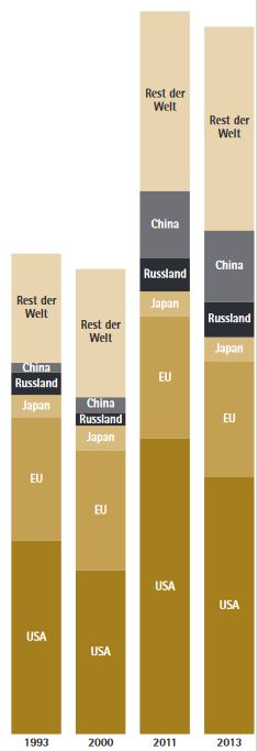 Wenden wir uns den Fakten zu. Die weltweiten Rüstungsausgaben sanken nach der Wende 1989/90 deutlich. Seit Mitte der 1990er Jahre steigen sie wieder massiv an – im Zeitraum 1993 bis 2013 von 1.156 Milliarden US-Dollar auf 1.702 Milliarden Dollar. Das entspricht , einem prozentualen Anstieg von 47,2 Prozent oder einem Wachstum um fast die Hälfte. Wobei hier bei allen Angaben, in der Tabelle und in der Grafik, die Inflation bereits berücksichtigt und „heraus gerechnet“ ist (die nominellen Zahlen wurden „deflationiert“ und alles in „konstanten Preisen“ gerechnet). Diese allgemeine Aufrüstung allerdings erinnert an die Zeit vor dem Ersten Weltkrieg. Geht man dann ins Detail, untersucht man die Aufteilung der weltweiten Rüstungsausgaben, dann kann man die folgenden fünf Charakteristika erkennen: