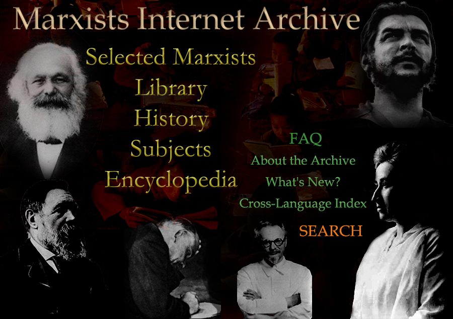 Selected Marxists Writers' Library History Archives Index Subject Archives Index Encyclopedia Frequently Asked Questions About the MIA What's New at the MIA? Access MIA in Other Languages Search the Archives Che Guevara Internet Archive Rosa Luxemburg Internet Archive Trotsky Internet Archive Lenin Internet Archive Marx/Engels Internet Archive Marx/Engels Internet Archive