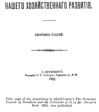 Portada de la recopilación en la que fue publicado el trabajo de V. I. Lenin, El contenido económico del populismo y su crítica en el libro del señor Struve. 1895. |