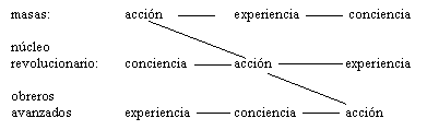 Por la forma en que están planteadas las cosas, es evidente que el punto de partida de esta discusión es una definición precisa de lo que es la vanguardia, qué papel cumple y cuáles son sus relaciones con el partido bolchevique. En el trabajo que citamos más arriba, [222] Mandel, adelantándose a las conclusiones del documento europeo, trató de dar una interpretación teórica sobre el nuevo papel del partido bolchevique y el de la vanguardia. En este cuadro que resume toda su concepción señala que hay tres segmentos fundamentales en la formación de la conciencia de clase: las masas, que avanzan de la acción a la experiencia y de allí a la conciencia; los obreros avanzados, de la experiencia a la conciencia y de la conciencia a la acción; y el núcleo revolucionario, de la conciencia a la acción y de allí a la experiencia: