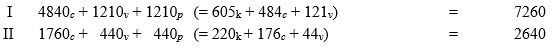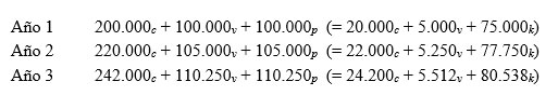 Para ilustrar de manera similar el caso con acumulación de capital debe especificarse la parte de plusvalía que se destina a acumulación; esta parte se agrega al capital el año siguiente (para simplificar suponemos un periodo de producción de un año) de manera que cada sector emplea un capital expandido. Supondremos que la mitad de la plusvalía se acumula (aumentando tanto el capital constante c como el capital variable v) y la otra mitad se consume (llamaremos al consumo k). El cálculo de la proporción entre el sector I y el sector II se complica, pero sigue siendo factible. Dados los supuestos, la proporción es 11:4, como muestran las siguientes cantidades: