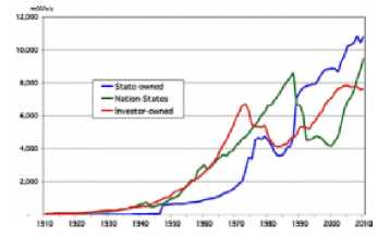 Of total industrial CO2 and CH4 emissions from 1751 to 2010, one-half has been emitted since 1984 (Marland et al., 2011). Of the emissions traced to carbon major fossil fuel and cement production, half has been emitted since 1986 (Fig. 1). Cumulatively, emissions of 315 GtCO2e have been traced to investor-owned entities, 288 GtCO2e to state-owned companies, and 312 GtCO2e to nation-states (Fig. 2). The dip in relative production by nation-states in the late 1980s through early 2000s is due to the collapse of the Soviet Union and the creation of new state-owned oil and natural gas entities in Russia as well as the transformation of China’s petroleum sector into state-owned entities.