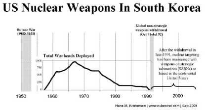 Eventually the frontline stabilized around the 38th parallel where it all began, and an armistice was signed in 1953. The two Koreas went near the brink of war multiple times since. US forces were stationed en masse in South Korea who brought with them nuclear weapons (at one time counting nearly one thousand warheads, see Figure 2), in breach of the armistice. The nukes were withdrawn in 1991 with the end of the Cold War, but the US still rehearses nuclear war scenarios in the peninsula through large-scale joint annual military exercises with South Korean forces.