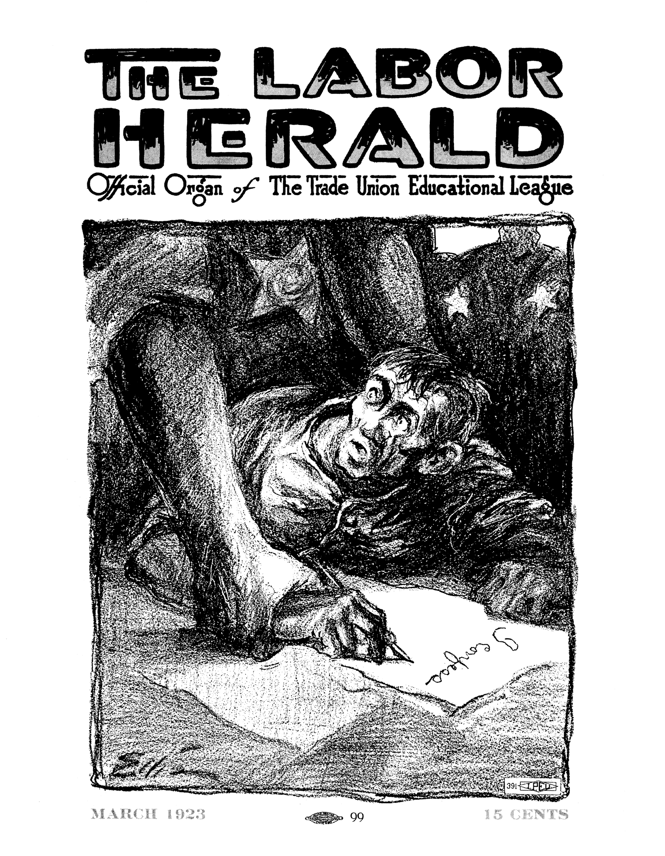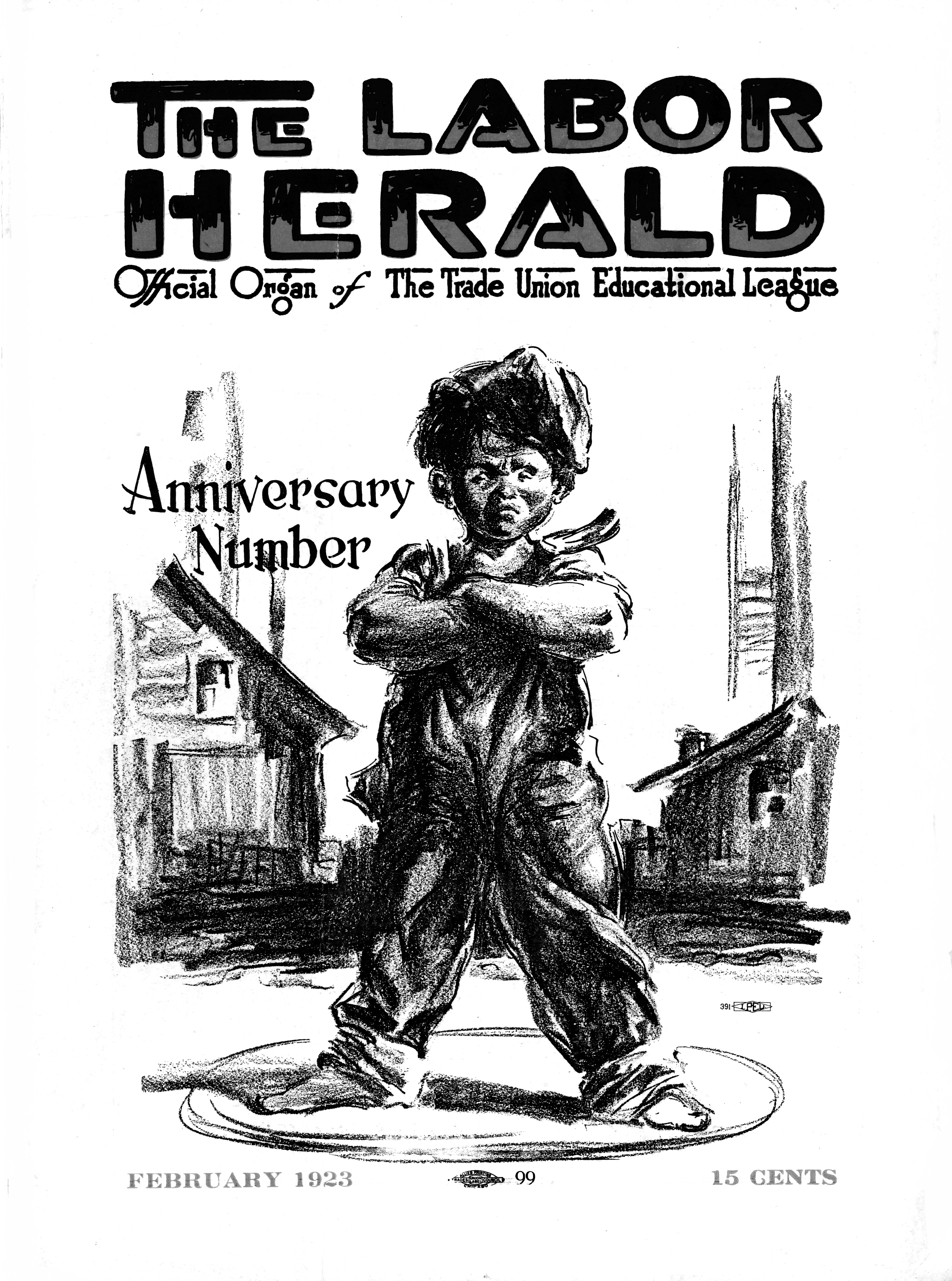 The Labor Herald was the official organ of the Trade Union Educational League (TUEL). Established by William Z. Foster in 1920 as a means of uniting radicals within various trade unions for a common plan of action. The group was subsidized by the Communist International via the Communist Party of America from 1922. The organization did not collect membership dues but instead ostensibly sought to both fund itself and to spread its ideas through the sale of pamphlets (a complete collection) and circulation of a monthly magazine. After several years of initial success, the group was marginalized by the unions of the American Federation of Labor, which objected to its strategy of “boring from within” existing unions in order to depose sitting union leaderships.