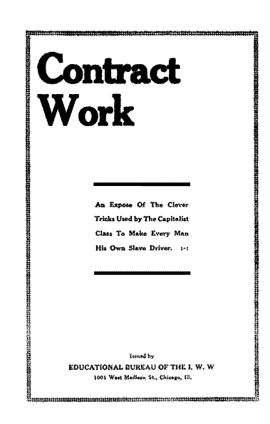 In every case, when contract work is first introduced, the toiler is given a chance to make a little more money in a little less time. But this situation does not last. The boss, you know, is an expert in the game of buying and selling. He doesn't produce anything, and it is only by the exercise of a low cunning, which he dignifies by the name of "business sense", that he is able to exploit labor at all. When the worker goes into business with the boss, he is abandoning his position as a wage worker, where he has at least a chance to quit the job if things aren't going right, and he ties himself up in a business deal where the practiced, trained trickery of the employer has every opportunity to cheat him. The workingman submits his income to the clever juggling of expert (and frequently dishonest) scalers, measurers or counters, who are going to make money for the boss if they can.
