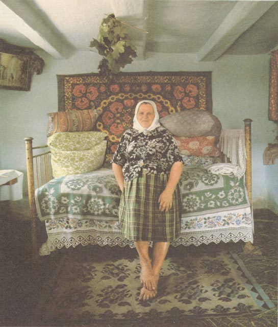 ![]() | A proud farmer displays her bedroom. Note the branch on the sealing, and the grass on the floor — the traditional way of observing the pentecost. (circa 1980s) |