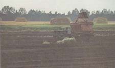 A harvesting machine digs up partially decompossed vegtable matter, which is collected, dried, and used for fuel. (circa 1980s) |