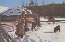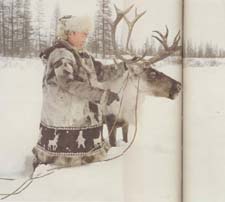 A Nenets collective herder tends to a reindeer. The collective farm he worked on held over 17,000 animals, and produced 350 tons of reindeer meat every year.(circa 1980s) |