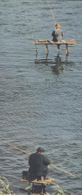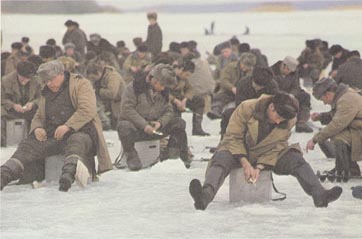 Fishing on a frozen lake, these ice-fishers are on their sweet spot. (circa 1980s) |