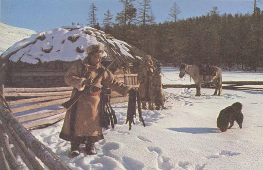 A siberian comes home from good hunting in the Altai region. He shakes out the sable furs, while his comrade cleans fox skins. (circa 1980s) |