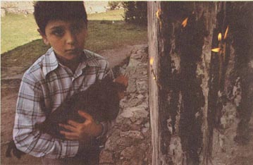 A boy carries a cockerel which will be sacrificed because his families prayers were answered. (1980s) |