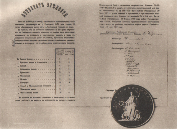 Diploma de maturitate şi medalia de aur primită de V. I. Lenin pentru succese la învăţătură la absolvirea liceului din Simbirsk