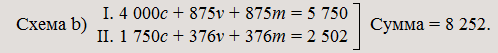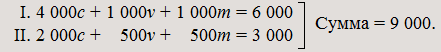 II. 1 500c + 299v + 201m = 2 000 в форме товаров. Общая сумма: 9 000 в товарном продукте.