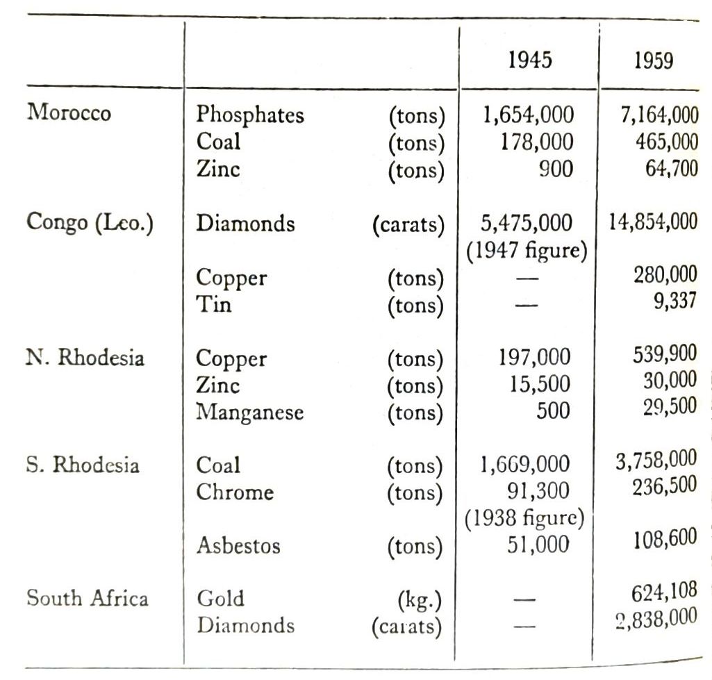 The following figures, taken from UN Statistical Year-books, illustrate the great rise in output of minerals in Africa in the post-war period: