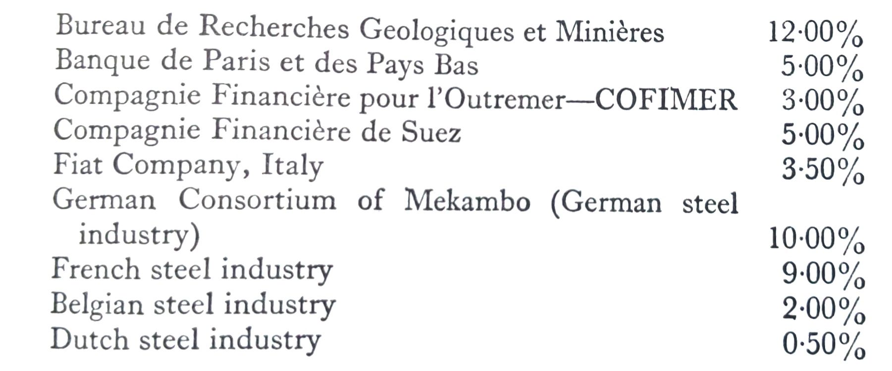 Gabon, whose timber has hitherto been its main export, has shown signs of possessing iron ore deposits since 1895. Investigations were carried out from 1938 by what was then the French Overseas Mining Bureau, transferred later to the Bureau de Recherches Geologiques et Minières, and joined by the Bethlehem Steel Company. The resultant company, Société des Mines de Fer de Mekambo, was established in 1955, with the major purpose of ‘creating a great centre of production capable of satisfying, at long term, a part of the anticipated needs of Western Europe’s steel industry and the future requirements of Bethlehem Steel’. Thus, in the participation, Bethlehem Steel has a 50 per cent holding. The other parties to the undertaking are: