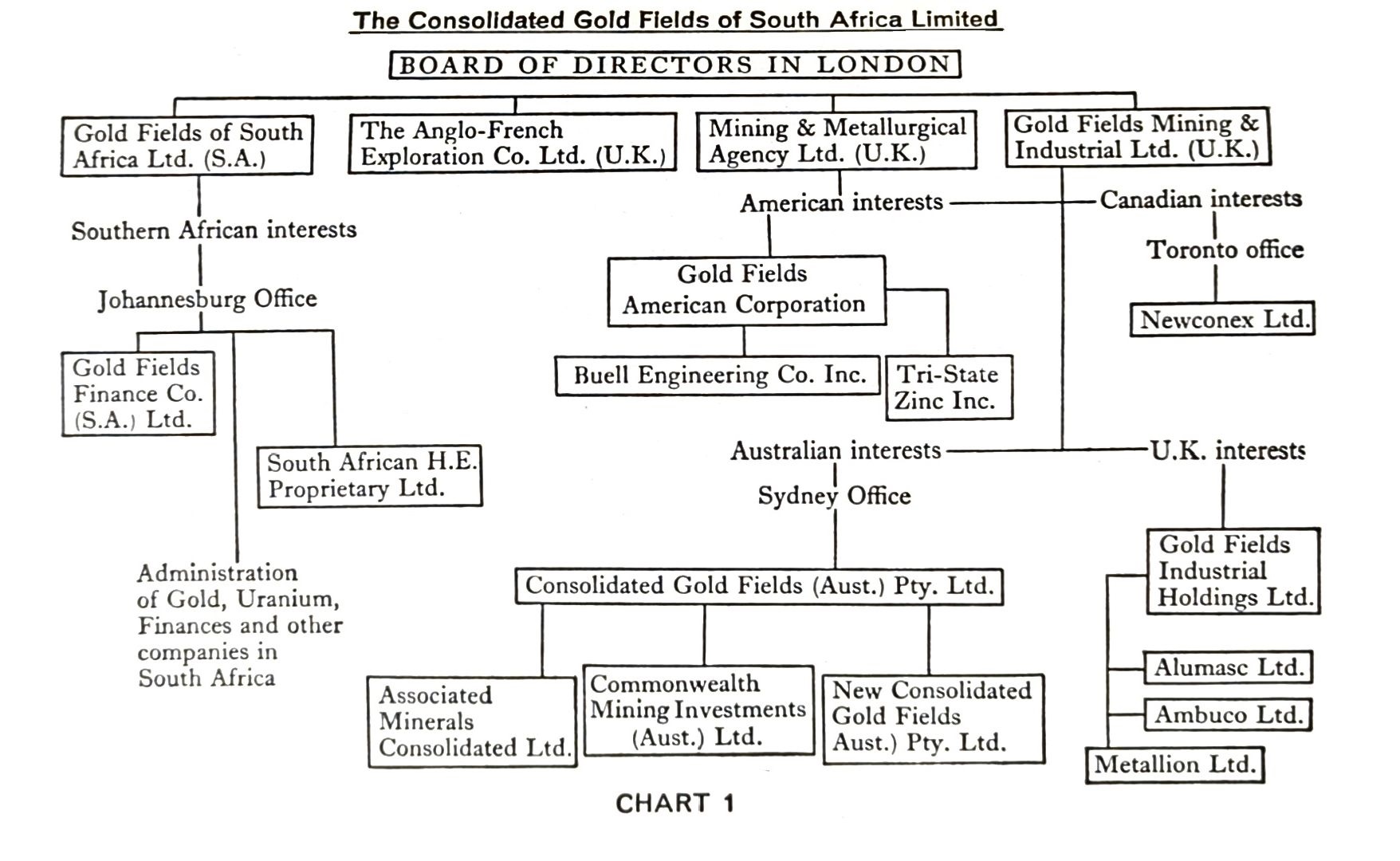 To supervise these interests and the planned absorption of others, a number of changes were made in the controlling companies, so that the group structure of Consolidated Gold Fields of South Africa Ltd. now has the appearance shown in Chart 1.