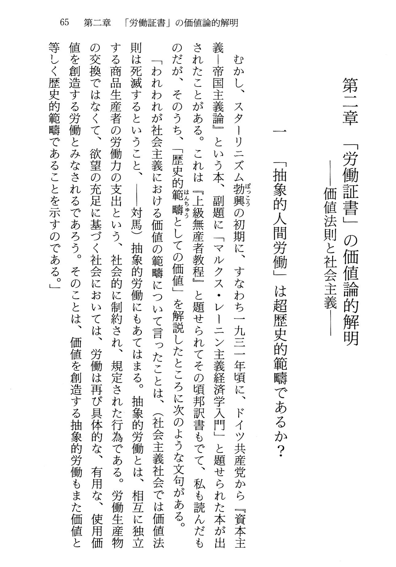 Looking at this, the difference between the commodity world and the non-commodity world (of which socialism is one example) is said to be whether abstract human labor is objectified to have the "character of value" or not, and "this abstract human labor" that provides the substance of value seems to be a supra-historical category. The person who has been the most active in insisting on this view is Samezō Kuruma. His comments have been directed against Shigeru Aihara, who has expressed doubts about this view. Kuruma writes: