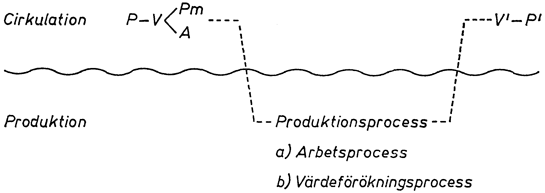 Kapitalets utvidgade formel innefattar som synes både cirkulation och produktion. Kapitalisten köper varor på marknaden som han sedan använder i produktionen. Produktionen frambringar nya varor som han sedan säljer på marknaden. Detta kan förtydligas i en figur. Våglinjen utgör gränsen mellan cirkulationssfären (varumarknaden) och produktionssfären (punkt 42).