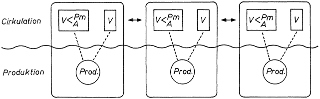 Den ekonomiska formen kapital är alltså en enhet av cirkulation och produktion. När vi tidigare analyserade den enkla varans och penningens ekonomiska former V-V och V-P-V eller P-V-P, så innefattade de endast cirkulationen. Produktionen var något utanför som inte berörde cirkulationens former. Kapital, däremot, måste nödvändigtvis inbegripa även produktionen. Låt oss sammanföra resonemanget i punkt 101 med tidigare figurer i punkt 42 och 43. Ett samhälle av kapitalistiska företag skulle då kunna tecknas så här.