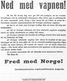 Motsättningarna skarpes inom socialdemokratin. En arbetarkongress utfärdar ett manifest "Fred till varje pris!" För detta åtalas två socialdemokrater, Zeth Höglund och Erik Hedén, och ungsocialisten Ivan Oljelund. Höglund dömes till ett års och Oljelund till 8 månaders straffarbete. |