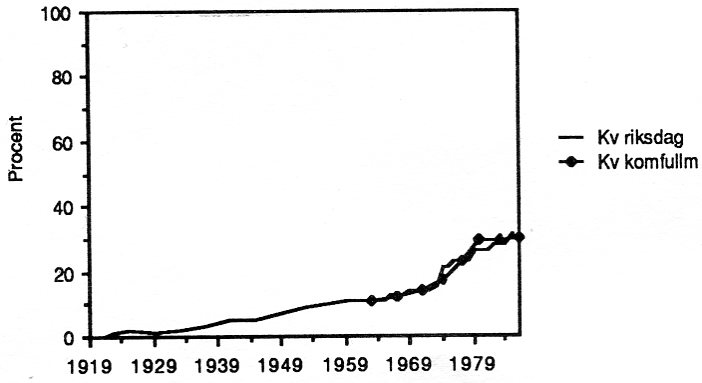 Andelen kvinnliga ledamöter i kommunfullmäktige och riksdag har varit låg. Den ligger nu på cirka 30 procent.