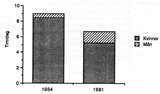 Källa: Den okända vardagen, aa: Boalt, tabell 5 och 19. Anm: Barnhämtning och reparationssysslor är ej medräknade 1981, eftersom de inte var med i 1954 års undersökning.
