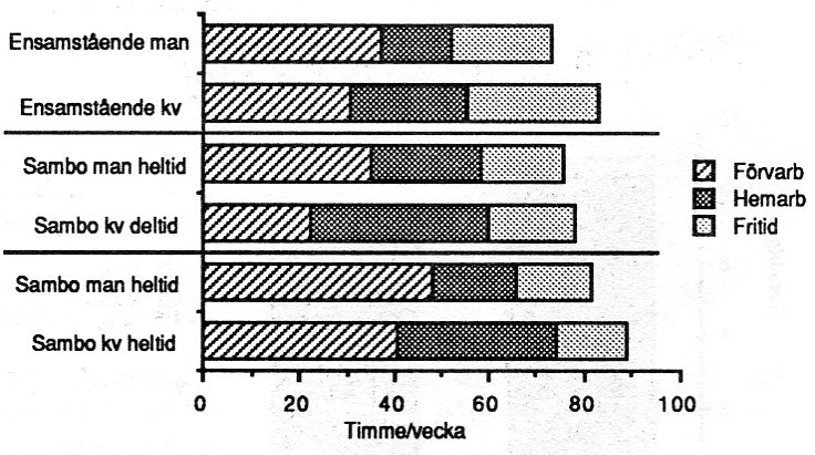 Som vi kan se av figuren ägnar kvinnor mer tid åt hemarbete än männen i alla tre hushållstyperna. Dessutom ökar kvinnornas hem arbete när de flyttar ihop med en man. Kvinnors hemarbete minskar inte särskilt mycket när de byter från deltids-(löne)arbete till heltid. De tar sig tid lite här och var, inklusive från fritiden. Varför män som bor tillsammans med deltidsarbetande kvinnor ägnar mer tid åt hemmet än vad män med heltidsarbetande kvinnor gör, kan inte utrönas från siffermaterialet. Antagligen har den förra gruppen fler småbarn än vad den andra har, och kanske tar barn tid också för männen.