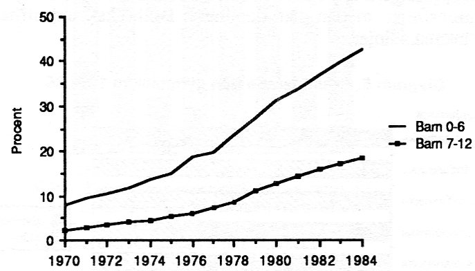 En viktig hävarm för kvinnors möjligheter att ta sig ut i förvärvslivet, är tillgången till barnomsorg. 1984 hade 26,2 procent av barnen i åldern 0 till 6 år plats på daghem och 16,4 procent på familjedaghem. För barn 7 till 12 år hade 10,8 procent plats på fritidshem och 7,7 på familjedaghem.