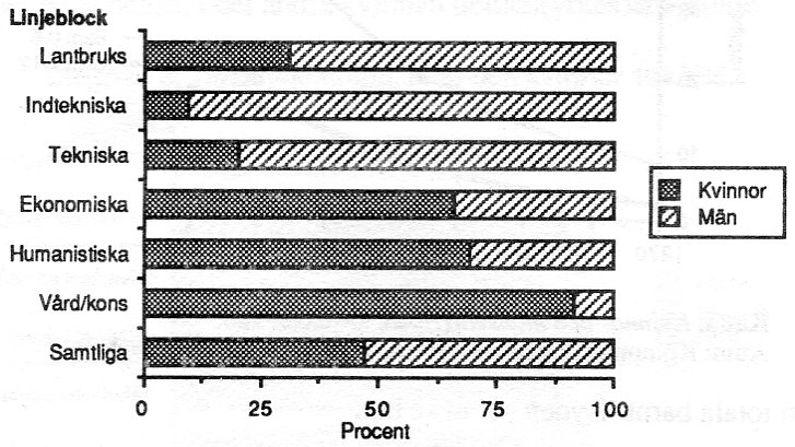 Men skillnaden i inriktning på utbildningen är fortfarande stor mellan män och kvinnor. Om vi ser till gymnasiet är kvinnorna där överrepresenterade på ekonomiska, humanistiska, vård- och konsumtionslinjer, medan män dominerar lantbruks-, industritekniska och tekniska linjer.