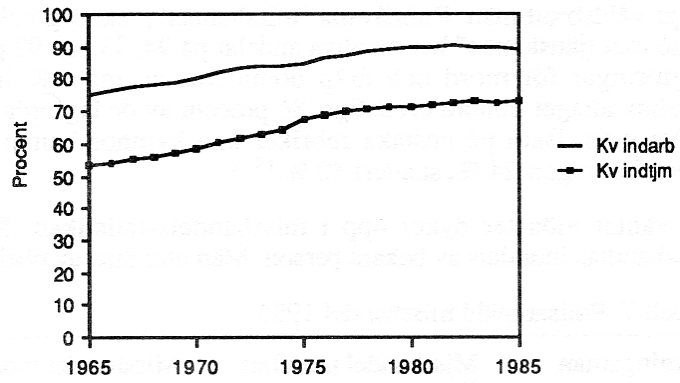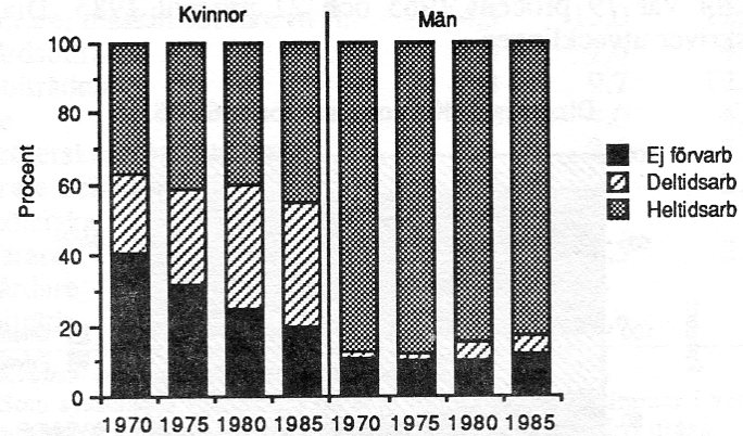 Kvinnors sysselsättning har ökat starkt sedan 1970. En halv miljon fler kvinnor har förvärvsarbete 1985. Sysselsättningsintensiteten (andel sysselsatta i åldersgruppen) har ökat från 44 procent 1970 till 66 procent 1985 i åldern 16-74 år. Männen har haft en negativ utveckling, från 78 till 74 procent (vilket antagligen har att göra med förtidspensioneringar). I nedanstående diagram visas sysselsättningsintensiteten för åldersgruppen 20-64 år. Siffrorna för 1985 är kvinnor: 80 procent sysselsatta, 45 procent heltid; män: 88 procent sysselsatta, 83 procent heltid.