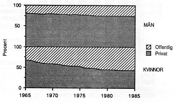 Kvinnor är främst sysselsatta i offentlig sektor. Kvinnors offentliga sysselsättning har ökat under de senaste 20 åren, från en andel på 33 procent 1965, till 57 procent 1985. Mäns sysselsättning i offentlig sektor var 19 procent 1965 och 27 procent 1985. Diagram 7 beskriver utvecklingen.